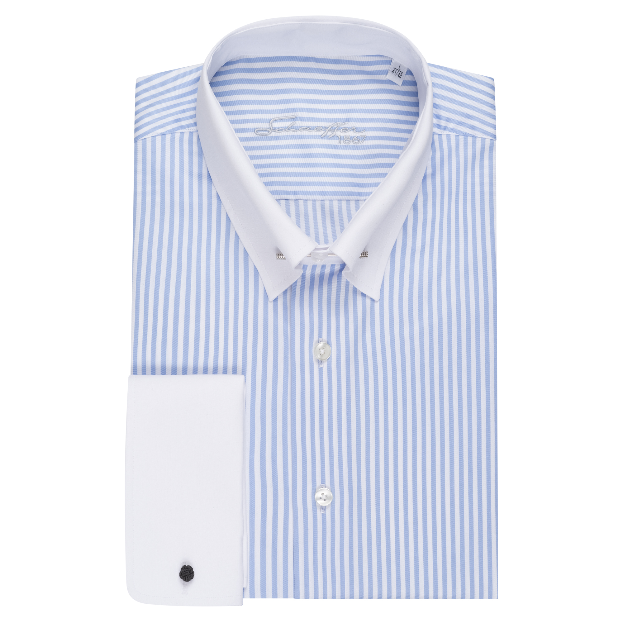 Unser klassischer Piccadilly Kragen verfügt über 2 umstickte Kragenlöcher und eine Piccadilly Nadel. Die Nadel sorgt für den perfekten halt der Krawatte und gibt dem Kragen eine wunderbare Form. Die Nadel besitzt an beiden Enden Nadelköpfe. Ein Nadelkopf ist mit einem Gewinde ausgestattet, so dass die Nadel ganz einfach an dem Kragen angebracht werden kann. Unsere hellblau gestreiften Schaeffer Hemden der Premium Line sind mit spitzen Piccadilly Kragen ausgestattet und werden aus hochwertigem Dobby Stoff gefertigt. Garn aus 100% Baumwolle wird zu einem feinen Stoff gewebt, der blickdicht und angenehm auf der Haut ist. Der spitze Piccadilly-Kragen und die eleganten Umschlagmanschetten lassen sich hervorragend zu vielen Anlässen kombinieren.